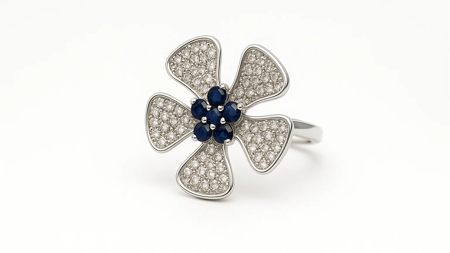 Add a touch of vibrant elegance to your jewelry collection with this stunning flower-inspired ring. Crafted from high-quality 925 sterling silver, this statement piece features a large, four-petal flower design. Each petal is meticulously set with brilliant white cubic zirconia stones, while the center is adorned with a cluster of deep blue stones, creating a beautiful contrast.