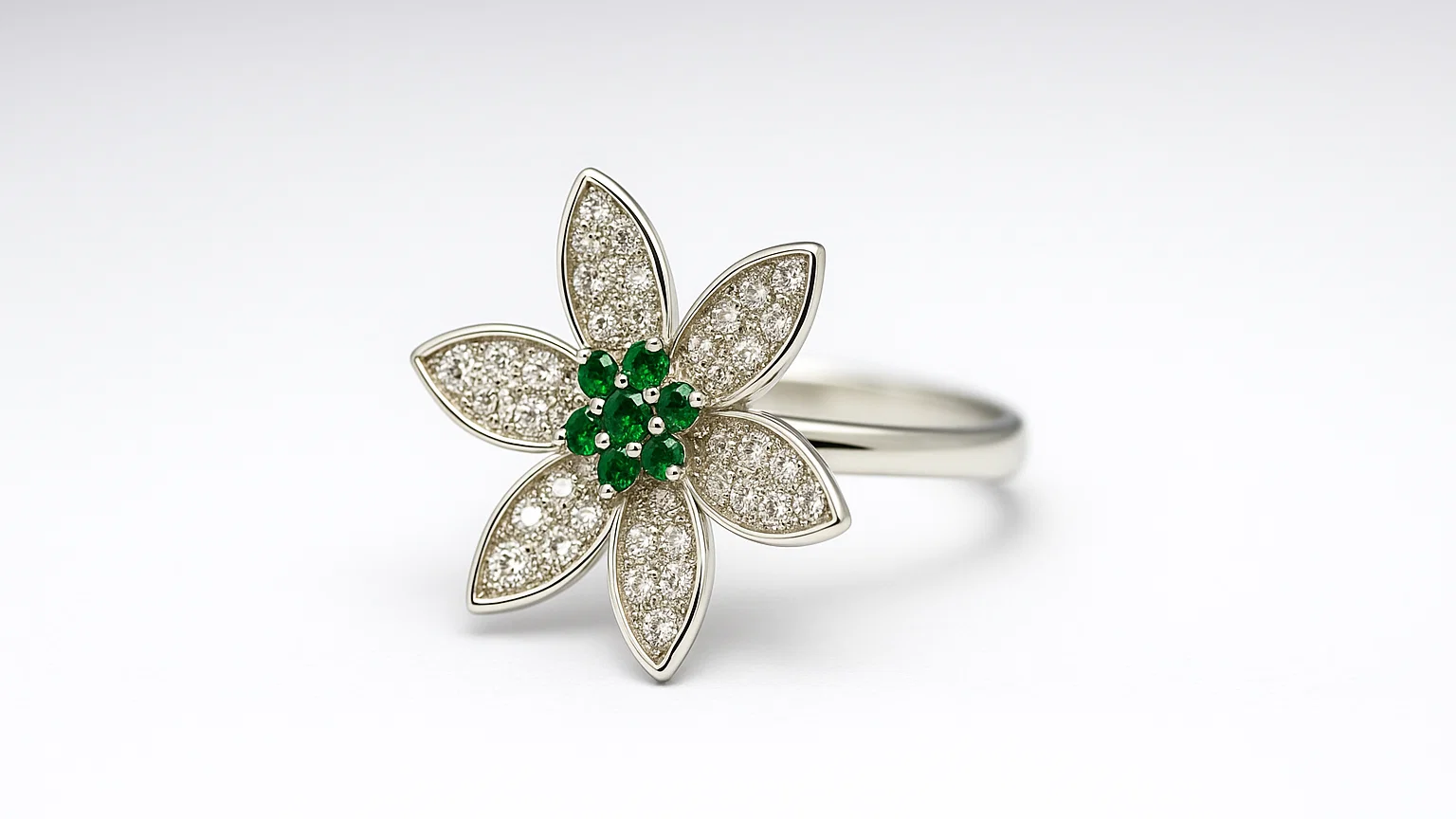 Silver Floral Ring with Green & White CZ – Elegant Designer Flower Ring