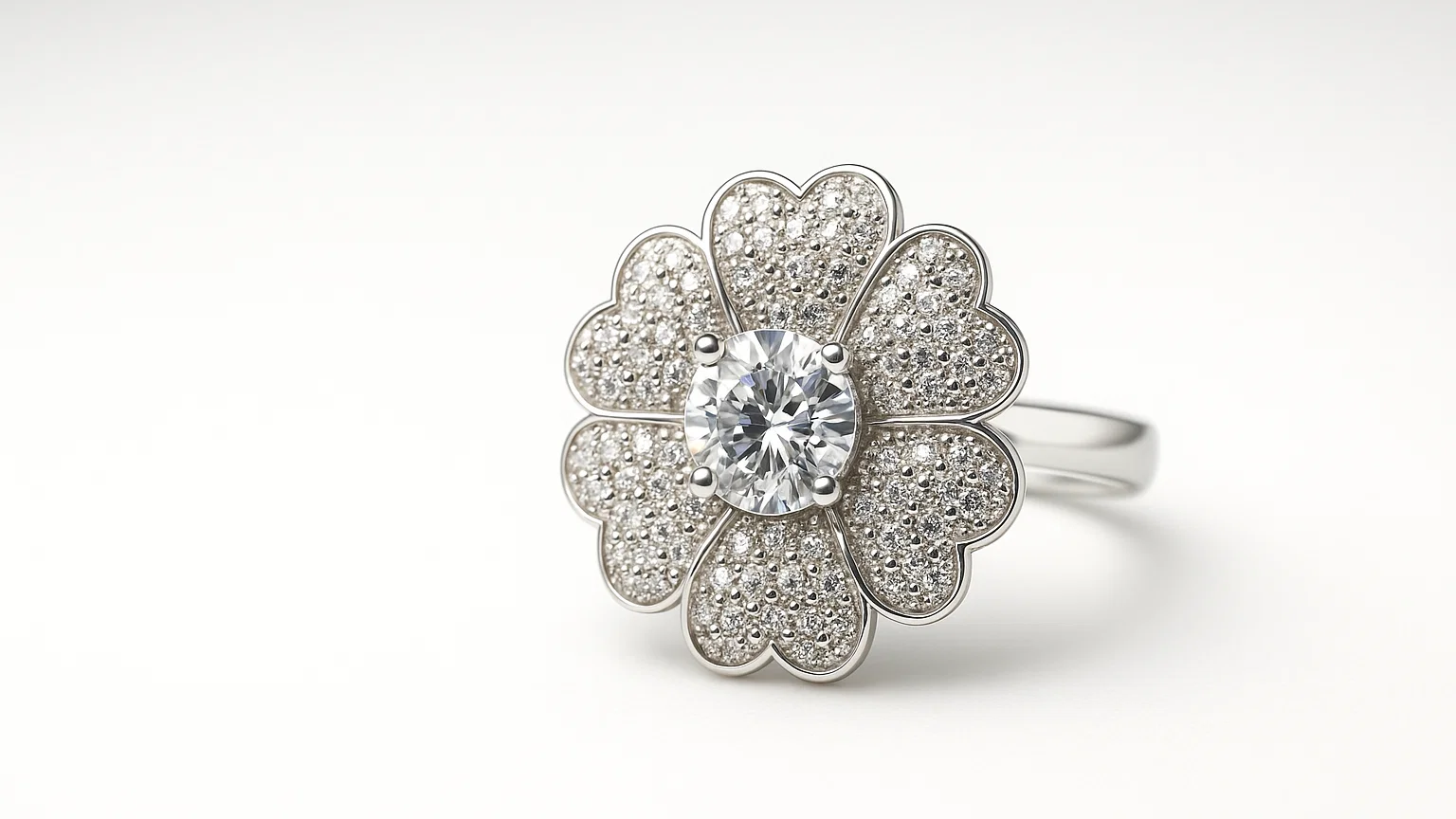 The "Starlight Bloom" Silver Ring—a radiant piece that captures the essence of a blossoming flower under a starry sky. This exquisite ring is expertly crafted from high-quality 925 sterling silver and features a stunning floral design. The center of the flower is set with a brilliant-cut cubic zirconia stone, which catches the light beautifully. Each petal is meticulously adorned with smaller, shimmering stones in a pavé setting, creating an incredible sparkle from every angle. This glamorous and eye-catching ring is perfect for special events or as a show-stopping addition to your everyday style.