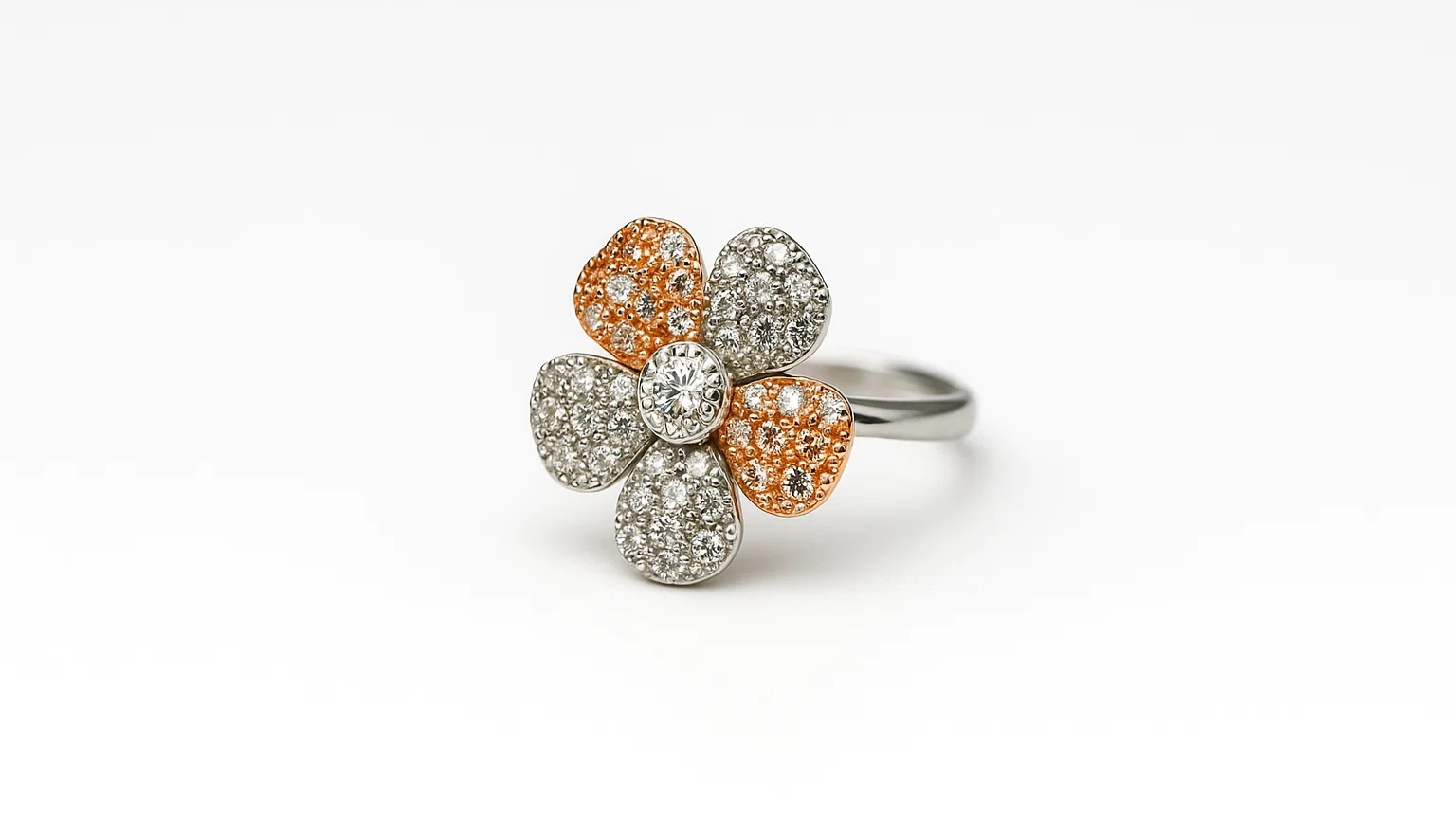 Sparkle and shine with this stunning silver ring! Featuring a delicate floral design with brilliant white and rose-gold stones, this piece is a perfect blend of modern style and timeless elegance. Wear it solo as a statement piece or stack it with other rings for a unique look.